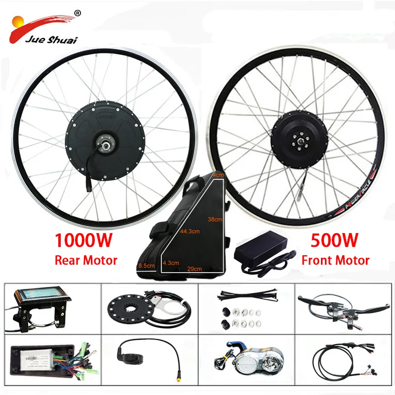 48V 500W 1000W Electric Bike Conversion Kit with 20AH Battery Rear Blushless Motor Wheel for 26" 700C e Bike Electronic Bike Kit This electric bike conversion kit include everything you need to convert your bike into electric bike, includes batteryPacking list1* 48v 1000w Rear Motor Wheel / 48V 500W Front Motor Wheel Size: 20inch/24inch/26inch/700C(28inch)2* Lithium Battery 48V20AH 3* Lithium Battery Charge ( Europe Standerd )Battery charger: 100-240V,50-60Hz input,2A smart charger4* Speed Sensor & Sensor disc plate ( PAS )5* S900LCD Display6* Waterproof Main Cable7* Brake levers with power cut-off when applied/ Brake Sensor8* Throttle ( Thumb Throttle or Half Twist or Twist Throttle )9* 48V intelligent controller with box10* Head Light11* Gifts: Sticker, rear light, bicycle bell12* Other Accessories REQUIREMENT* Min Rear Fork Width Requirement: 135MM* Min Front Fork Width Requirement: 100-105MMPACKAGE* GW/NW: 19/16KGKindly leave us order message in this format after you place an order:Throttle: thumb/ half throttle/ twist PERFORMANCE* Max speed: 500w(40-45km/h)1000w(45km-50km)* Range Per Charge : 30-40km by throttle, 40-50km by PAS depending on Riders Weight, Road Conditions, Etc.* Charging time: 4-6 hours depend on previous battery level If you choose 48V 500W front motor wheel, please confirm if your front fork length is 100-105mm, If you choose 48V 1000W rear motor wheel, please confirm your rear fork length is 135mm. Any question, feel free to contact seller 48V500W Front Motor 48V1000W Rear Motor