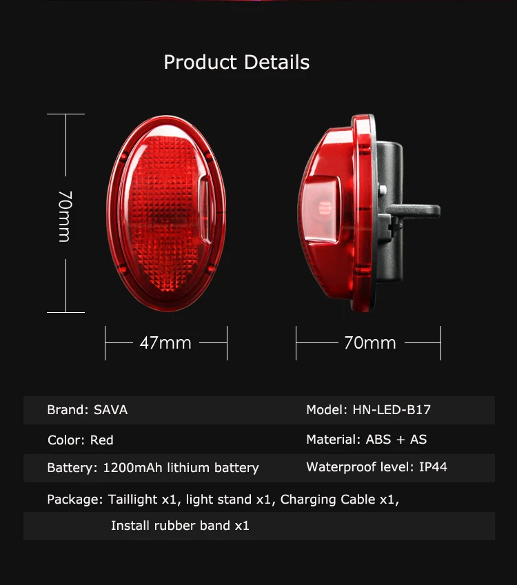 SAVA Bicycle Rear Light Bicycle Accessories USB Bike Rear Light Rear Bike tail lights Laser Cycling Safety Flashlight LED laser SAVA Laser Rear Bicycle Tail Light Product Specification Model:HN-LED-B17 Material:ABS+AS Color:Red Waterproof Lever: IP44 Product weight: 60g Battery: 1200 mAh Rechargeable Lithium battery Battery capacity:1200mAh Blubs: 6 Brightness LED Blubs Packing list: Tail Light*1 USB charge line*1 Install rubber band*1 Light holder*1 CR2032 Li Button Battery *1 7 modes of flashing way: 1.LED Cycling flashing mode 2.LED Steady 3.LED slow flashing 4.LED fast flashing 5.LD Steady 6.LD Slow flashin 7.LD fast flashing We love outdoor sports and cycling as you do! And know the importance of safety. SAVA Laser Rear Bicycle Tail Light Give you safer cycling environment ,Let you enjoy cycling without concern. Important Informations: Shipping: *We ship to worldwide countries, via EMS/DHL/UPS. *Items are shipped from EMS, reach most of the countries within 5 to 15 business days. Delivery time depends on destination and other factors, EMS may takes up to 20 business days; *DHL usually takes 2-7 business days, and it may take up to 12 business days because of the destination and other factors; - DHL need more shipping cost. *Normally, we ship the goods via EMS or our own forwarder by courier. If clients want the goods to be shipped by DHL,UPS or TNT, Please contact us in advance. *For EU countries customers,SAVA bikes are shipped to you from our central distribution hub in Hannover, Germany. Our qualified bike mechanics will inspect every bike before we ship them to you. This means attractive priced, high quality bicycles without the dreadful waiting time. Payment: Payment is Escrow and Alipay In Aliexpress website, 100% safe payment at here. you make payment to Aliexpress company, and when you receive the product, they can release the money to store owner. Customs Charge (Import Tax): Payingtaxisthedutyofeverycitizen,buyerneedtotakeresponsibilityofalloftaxes.Ifbuyerrefusetoreceivethegoodsbecauseofthetaxproblem,theyneedtopayforallthefreight.(ifyouneeddeclarelowervalue,pleaseremarktous.) ThebuyerswhocomefromThoseCountrydonotneedtoworryaboutthecustomsclearance,wewilldotheCustomsClearanceandpaytax. NorthAmerica:UnitedStates. Europe:Austria,Belgium,Bulgaria,Denmark,Estonia,Finland,Greece,Hungary,Ireland,Poland,Portugal,Romania,Sweden,Luxembourg,Lithuania,UnitedKingdom,France,Italy,Germany,Switzerland,RussianFederation Spain,Czech Republic,Latvia,Croatia. Oceania:Australia. Asia: Japan, South Korea,Russia,Singapore,Malaysia,United Arab Emirates,Thailand,Vietnam,Kazakhstan. Warranty & Refund: 1)Please carefully inspect all items immediately when u sign it. If there is any obvious freigh damage. DO NOT sign the freight bill unless the damage is noted on the freight bill.The client has the option of rejecting the shipment at the time of delivery. If the item is defective after you sign and open the package, please notify us within 48hours with pictures of the defective item. We will work with customers to solve any problem. we will help u deal with the case within 2 days and give you a satisfied solution . 2) Products MUST BE returned within seven (7) days or the return will be disallowed All returns must be freight prepaid by the Sender or carrier.All returns are to be shipped back to company?s warehouse in its ORIGINAL PACKAGING.New items or Repaired items will be shipped to you after we receive the items for replacement .Refund will be granted after we receive the returned items in original packing.