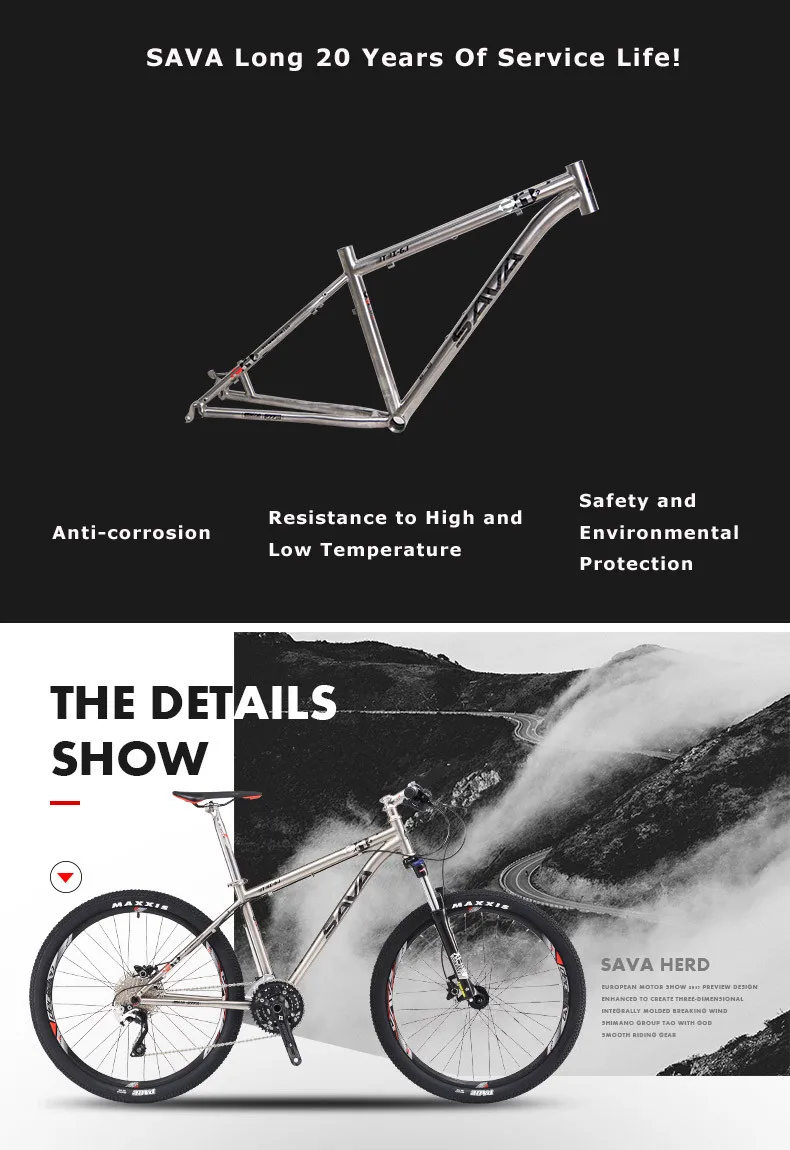 SAVA Titanium bike Titanium bicycle frame bike 27.5er mountain bike 16/17 inch titanium mtb Ti material bicycle parts 30 Speed How about the shipping time and VAT tax ? 1. Item shipped by air to EU firstly (without updated information on UPS website) then UPS pick it up and complete the delivery (Tracking information updated). 2. Shipping takes 7-15 working daysto deliver to EU. 3. TAX will be prepaid by us TO EU, US ,RUSSIA.Japan,South Korea etc. 4. If you need any help, please don't hesitate to contact us, it will be our pleasure to provide you with any assistance you might need. High Quality compontentry: Ready to get out and explore! Product Details: Product Model: Ajazz Package Size: 1380*220*750 Wheel Size: 27.5 inch / 26 inch Frame Size: 16 inch / 17inch Color: Titanium Height: 165-185cm / 160 -180cm Weight: 11.6KG / 25.57lb (not include package) Specification: Material: Titanium Alloy Frame: 26*17" / 27.5*16" Titanium Fork: SAVA Hydraulic Air suspension fork ,disc brake. Handlebar: W620*31.8,w/laser SAVA LOGO,alloy,color similar as titanium Headset: GH-608 1-1/8'' Alloy, SAVA logo Stem: 90*31.8, w/laser SAVA LOGO,alloy,color similar as titanium Saddle: SAVA Leather Saddle Seat Post: 31.6*350, w/laser SAVA LOGO alloy,color smilar as titanium Derailleur / Brake System: Shift lever: SHIMANO SL-M6000, DEORE Front Derailleur: SHIMANO FD-M6000 DEORE Rear Derailleur: SHIMANO RD-M6000 DEORE Brakes: SHIMANO BD-M315 RF-750MM,LR-1400MM Transmission Control System: Freewheel: CS-M6010 11-34T 10S,cassette sprocket Chainwheel: TEN-601-TT 42/32/24T*170 10S, black Chain: KMC X10/GY/BR/110L/PPO, brown Pedals: Full Alloy Wheelset System: Rim: W319LF 27.5/26*32H*14G, anodized black Hub: XY, Four bearings, Disc Hub Tires:MICHELN 27.5*2.10 Country Race,r 30 TPI / Maxxis 26*2.10 Accessories: Multi Assemble tools, User Manual Ready Ride by SAVA: Be riding sooner than ever before! Our program allows you to spend less time assembling your new bike. SAVA Ready Ride bikes are hand-built and shipped straight to you. All you need to do is put on the front wheel, seat, and pedals. Yes, the brakes are dialed in and the derailleurs are adjusted: just pump up the tires and get out to ride.